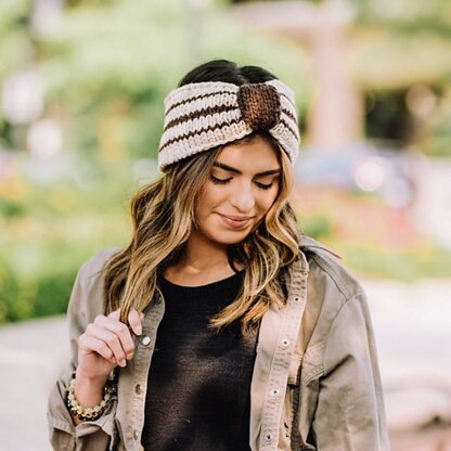 Worked in the round using three strands of yarn held together, this warm, chunky headband is the perfect autumn and winter accessory. We’ve paired three natural colors of undyed wool to create the two-tone background, with bold chocolate stripes. A complementary fleece lining makes the headband extra cozy, while adding another shade of natural color. The piece is finished off with a dark brown tie in the front, adding a touch of character and interest to the design.