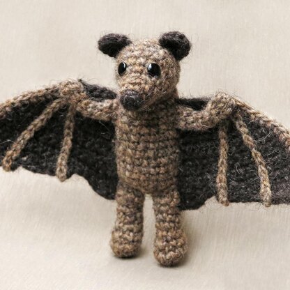 Materials For this cool bat you’ll need worsted weight yarn and an E US/3.5 mm crochet hook. You’ll need two colours of yarn, brown black (1/8 of a 100 yard skein), and murky brown (1/4). These quantities are estimates. For the eyes I’ve used 8 mm animal eyes and crocheted a nose. You will also need fibrefill and pellets for a bit of extra weight in the body (I use Hama beads). Lopi colour numbers: 0052 and 1420.