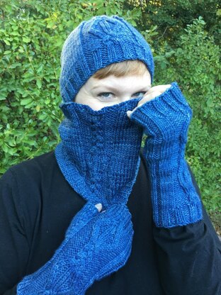 Brynhild is a cowl featuring a braided cable reminiscent of an old Norse rune. Its name is from the Saga of the Volsungs, an Icelandic saga. Its companions, Sigurd and Aslaug, are the matching hat and fingerless mitts.