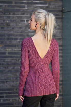 Named Bubala Yiddish for close to one’s heart is this cabled pullover with bobbles. A deep v-neck that can be worn on the front or on the back, split the cable into two single cables. The same single cable adorn the sleeve. Ribbing frame the cables in the sides and make the sweater figure hugging. The v-neck ends in an I-cord bind-off. Bubala is knitted in the bouncy Sølje pelt wool from Hillesvåg Ullvarefabrikk.