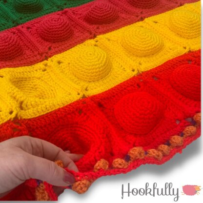 The bubble burst blanket is great fun for children for both playtime and bedtime. It has rows of large bubbles to burst and the blanket border has smaller bubbles the also pop out. The large bubbles are made by making individual squares which are crocheted together during the project (no-sew). The smaller bubbles on the blanket border are made using the popcorn stitch (instructions included). You can make the blanket as small or as big as you like by simply adding or removing squares.
