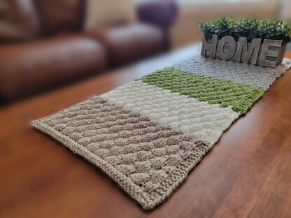 This lovely knitted table runner is quite an easy knit. It uses a lot of familiar knit and purl stitches with one more special stitch. Enjoy drinking wine, watching a show, sitting at the park watching the dogs and kids play.