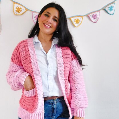 Introducing the Bubblegum crochet cardigan. A fun and colourful design, featuring colour blocking, drop shoulders fit and balloon sleeves. This is a quick crochet project as it requires chunky yarn and 7mm crochet hook, making it great for beginners. This crochet pattern also features a ribbed neckline and hemline. This sample is made using wool yarn, making it a crochet winter cardi but you can use cotton yarn and it would be perfect for spring/summer.