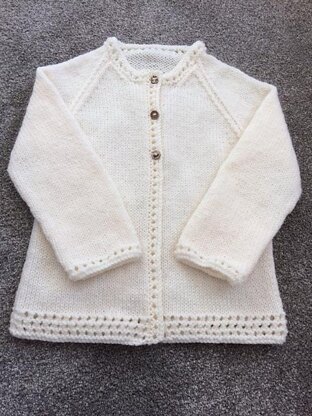 This simple cardigan is the perfect cover up for cooler days. The back, fronts and sleeves are worked flat, separately from the bottom up; the neck is worked after all the seams are stitched; then stitches are picked up along the edges of the fronts to make the bands. The pattern itself uses just basic knit and purl stitches with yarn forwards and yarn overs to make the eyelets. Instructions are written in full, making this an ideal project for an intermediate knitter or a confident beginner who’s ready to learn a new technique.