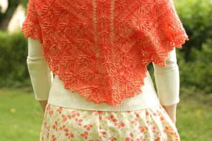 Coral shawl used 1 skein Madelinetosh Tosh Merino Light in Grapefruit100% Merino, 420 yd/ 384 m per 100g on 3.5 mm (US 4) needles. Blocked size is 104 x 51 cm (41 x 20 inches). Gauge: 18 stitches = 10 cm in polyps pattern.