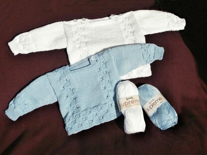Materials needed: Wendy Supreme Luxury 4-ply cotton, Ice Blue 1824 or White 1820: 2(2) x 100 g balls [265 m/295 yds]; pair 3 mm [US 2] needles; 3 mm [US 2] circular needle 40 cm/16 ins long; 1¼ m/1¾ yds narrow ribbon; 4 small buttons.