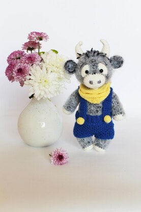 Crochet bull toy pattern in PDF format. It consists of 18 pages accompanied by more than 50 photos of step-by-step written instruction. The finished size of the toy using the materials stated in the pattern is 6 inches height with horns.