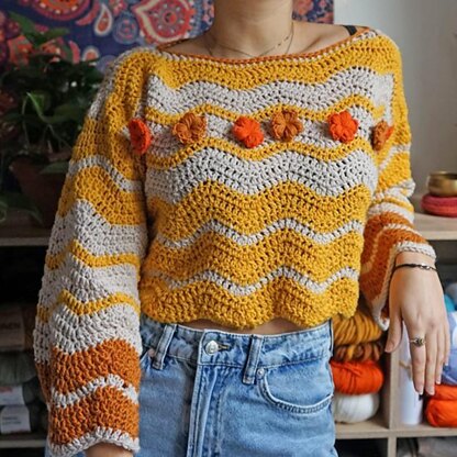 Bumblebee is a 3/4 sleeve striped colorful sweater with fun flower appliques! The pattern comes in 6 Sizes : XS- S/M - L - XL/2XL - 3XL/4XL - 5XL, see pictures for final garment measurements.