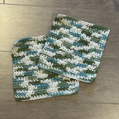 Sizes: One size (adjustable). Dishcloth A is 18 x 18 cm (approx. 7 x 7 inches), and Dishcloth B is 16 x 16 cm [approx. 6 ¼ x 6 ¼ in]. Width can be adjusted by increasing or decreasing the number of starting chains. Length can be adjusted by increasing or decreasing the number of pattern repeats (rows 3 and 4).
