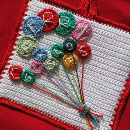 This is an original pattern for a colourful crocheted double thickness potholder with a colorful bunch of balloons with a Christmas message on the front. The reverse is worked in Moss Stitch in cream, and both thicknesses are joined by a double row of crochet in red. You could of course embroider any message on the balloons - perfect for happy birthday, anniversary, etc.
