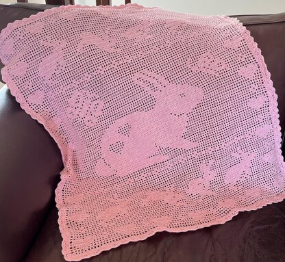 This is a detailed graph for a filet baby blanket featuring bunnies and butterflies. It only uses double crochet (us) and chain. It presumes that one already knows the basics of filet crochet. Any border can be added. The graph is easy to follow and blanket quick to work up. I used Elle baby 4ply and 3.5mm crochet. It used 250g (50gx5 balls).The end product was 80x90cm. It can be worked in any yarn and corresponding hook.
