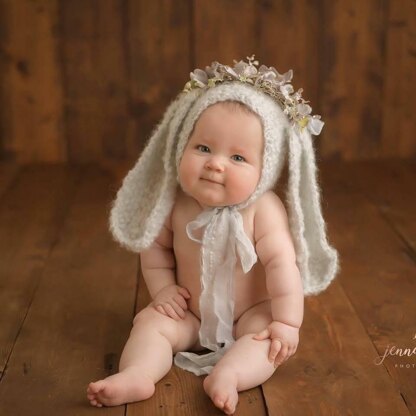 The pattern for this Sitter(6-12m) BUNNY Bonnet.. It would be lovely choice as a gift. It would also make a beautiful photography .The bonnet is knitted flat and sewed together .the flowers accents are optional, but a picture tutorial is included.