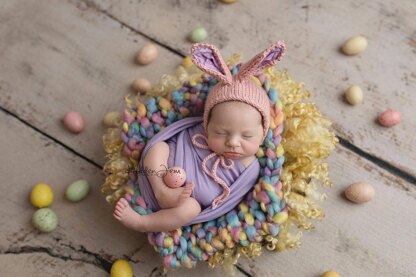 The completed bunny bonnet is a photo prop to be used with supervision in newborn and sitter photography sessions. It is also a lovely addition to your favourite 18" doll's wardrobe.
