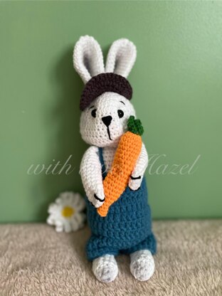 Meet Oakley, the second character in my "Meadow & Friends" crochet series! This charming handcrafted bunny is Meadow's good friend, always ready for adventure by her side. Standing at 27cm tall, he’s dressed in his little blue dungarees, cosy half cap, and holding a carrot, his favourite snack! With his playful nature and curious spirit, Oakley loves exploring the meadow, collecting carrots, and keeping Meadow company on sunny picnics. Every stitch is made with love, from his fluffy tail to his embroidered features, making him the perfect cuddly companion, keepsake, or gift.