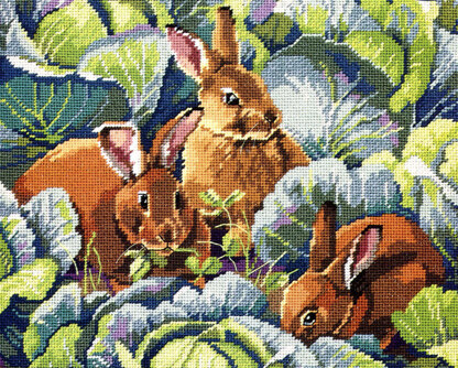 Designed by: Nancy Rossi. Three bunny’s nibbling clover peek out from the cabbage patch in this realistic and elegant Bunny’s Cabbage Garden design by designer Linda Gillum. This design works up just as well in needlepoint as in cross stitch since there is no backstitching and would look great in big stitch on 6 count Aida fabric. A classic design for the gardener in your life.\n