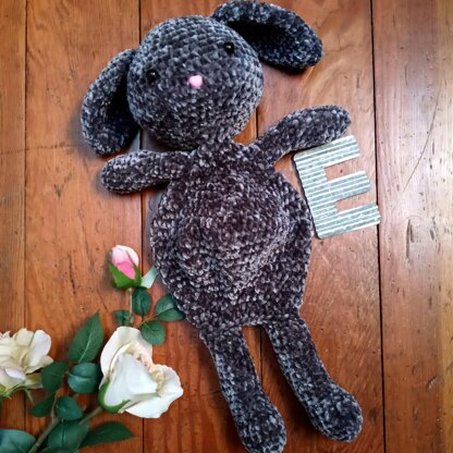 The Bunny Snuggler is a fun amigurumi style lovey made with chunky velvet yarn. It is great for little ones to snuggle with for comfort or play.