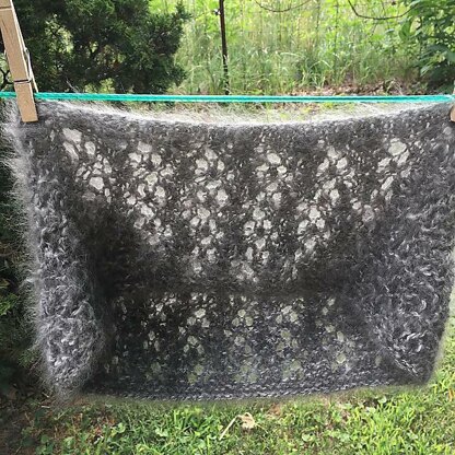 The designer used 126 yards/66g handspun 100% angora yarn. Gauge unblocked = 20 sts and 24 rows = 4" blocked = 16 sts and 22 rows = 4"
