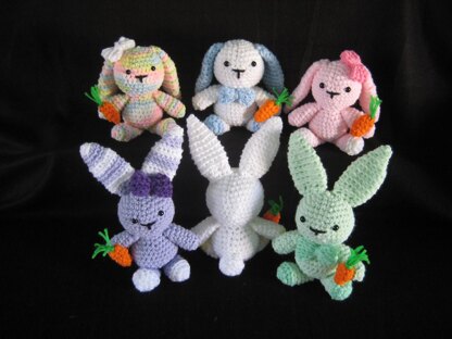 Cute little bunny pattern includes both variations for ears; straight up or floppy. Head and body are worked as one piece so no need to sew head separately. Back side has a little "bunny tail" Bow and carrot pattern is included. Looks great in solid color or variations of 2-3 colors.