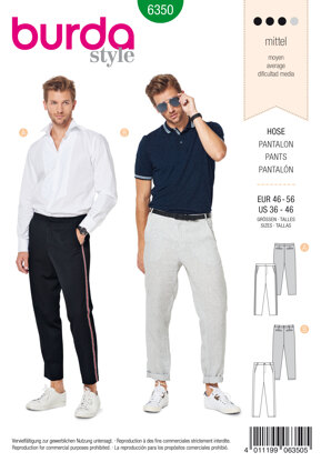 Burda Style Men's pants B6350 - Paper Pattern, Size 36-46 is a Intermediate Sewing pattern by Burda Style, available as a Paper Pattern and includes instructions in English, French, Spanish. Super fun to make, this pattern could be your next masterpiece!
