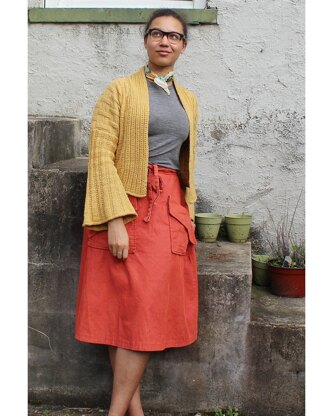 Burkhart is a cropped shawl neck cardigan with flared sleeves and a slight 70’s vibe. The textured rib and body stitches are easy to master and the simple body shaping makes this a great project to work while relaxing with a podcast or movie. This is a great project for a first sweater. Each piece is worked individually. The body is worked top down and sleeves are knit in the round, avoiding lengthy under arm seams. Everything is seamed together after blocking