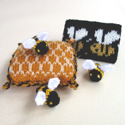 The busy bees are very quick and easy to knit using black, yellow and white DK yarn. The honeycomb pattern graph will enable you to knit the pin cushion using cinnamon and cream DK yarn.