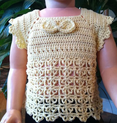 This top is so easy to make and so practical but oh so pretty and feminine too! The top is a simple yoke, with a textured lacy stitch at the bottom and a lacy scalloped hem and armhole finish. It closes in the back with two buttons. The top can be worn alone or as a vest and make the bottom longer and turn this pretty little top into a dress!