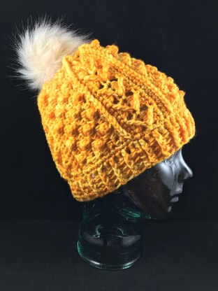 | One size only: | 9.25" x 19" aroundCome learn how to make a delightful hat that features the popcorn- arrow and low front ridge stitches topped with a pompom! This hat looks great in any color and has a lot of ease built into the brim. |