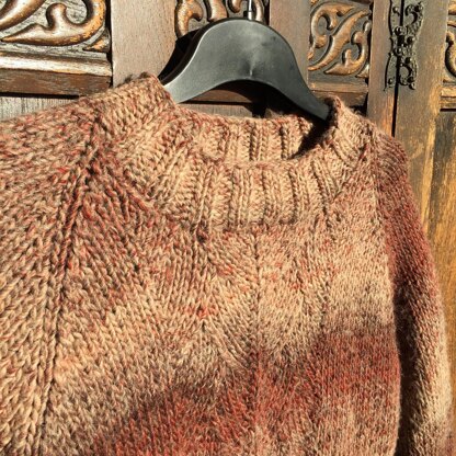 The instructions are for flat knitting the back, front and sleeves separately from the bottom up. The neckband is formed by picking up stitches around the neckline after the right shoulder seam has been joined.