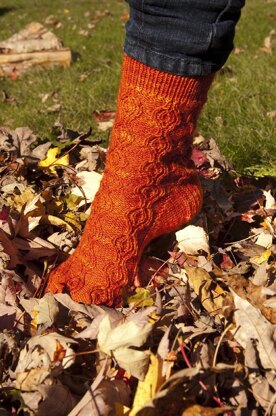Fil : Julie Asselin Nanos (70% merino, 10% cachemire, 10% nylon), 1x 115g, 37 0m (400yds). Coloris Blazing sunset Taille unique : Femme (largeur moyenne, environ 22 cm de circonférence au plus large du pied, au début des orteils). Note importante : Si vous voulez avoir une chaussette plus étroite ou plus large, vous pouvez diminuer ou augmenter votre taille d’aiguilles de 0,25 mm. Échantillon : 36m x 44rgs = 10 cm (4’’) jersey end. Aiguilles : 2,5 mm (US 1,5) circulaires 80 cm (32’’). Autre matériel : 1 aig à laine pour rentrer les fils.