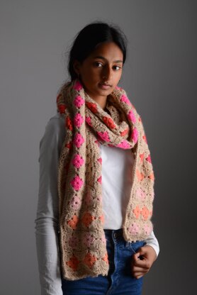This beautiful scarf is made from mini granny squares which are joined with rows of granny stripes when you make it up. You could have lots of fun using different colours for the squares – I’ve gone for five different shades of pink – and there are countless ways of arranging them in the final garment.**You will need:**Mrs Moon Plump DK: 4 x main colour (MC) (shown in Toffee) 1 x Plump DK in each of the five contrast colours (shown in CC1 Fondant Fancy, CC2 Marshmallow, CC3 Rhubarb Crumble, CC4 Raspberry Ripple, CC5 Bubblegum)