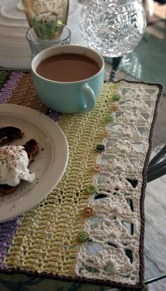 This place mat, while incorporating easy stripes, starts with the lace border and just one package of Lion Brand Bonbons. Stitches are then picked up along one long side for working the stripes and, after being edged in a dark color for contrast, the all-important button finishing is added. Don’t feel you need to be matchy-matchy with the buttons or even the Bonbons – get creative with color and texture by mixing and matching both materials.