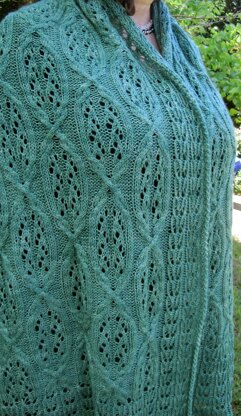 This is a pattern for a knit shawl that features two lace (and cable-lace) stitches that come to us from Japan. The focal stitch is an intricate and unique cable lace stitch that makes quite a statement. The border stitches are also unique, but quite a bit easier to knit. Combined, they make a one of a kind shawl, quickly becoming an heirloom.