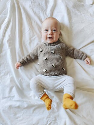 Yarn: You will need between 2 and 4 balls of Debbie Bliss Baby Cashmerino - 213 (240 : 290 : 328) [385 : 475]m / 234 (263 : 318 : 359) [422 : 520] yds. You will also need yarn in yellow, white and black for the bees (photographed sweater features Debbie Bliss Baby Cashmerino in Primrose, White and Black).