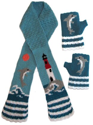 Stunning Crochet Set of Fashionable Scarf and Fingerless Mitts perfect for those cool Spring and Summer evenings, featuring dolphins frolicking in the waves and a serene lighthouse.