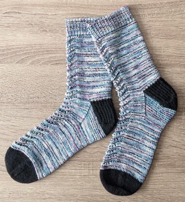 The sock comes in 3 sizes and is knit from the top down with a contrast heel flap and traditional gusset. I finished it with my version of a rounded toe.
