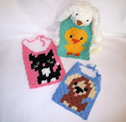 Crochet this darling Trio of Baby Bibs in the fun C2C (corner to corner) technique.