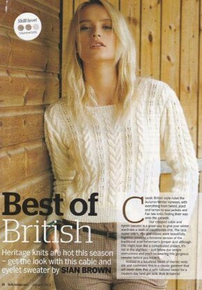 Cable and eyelet sweater, originally published in Knit Today. A round neck sweater with cables and eyelets repeated across the body and sleeves. 2 x 2 rib edges. Photo Knit Today. The yarn has been discontinued. Any yarn knitting to the standard DK tension of 22/28 can be used.