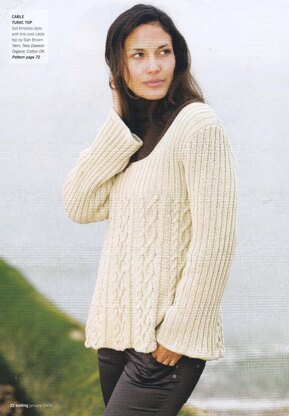 This is a pattern for a Cable and Rib Tunic, originally published in Knitting magazine. It has a cable panel repeating on the back and front, and rib sleeves, with garter stitch edging. The yarn is not available now, any yarn knitting to the tension can be used. Photos Laurel Guilfoyle for Knitting magazine.