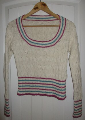 This is a pattern for a cable jumper with striped rib, originally published in Knitting magazine. It has a simple twist cable and striped rib borders. Photo on model by Lauren Guilfoyle for Knitting magazine.