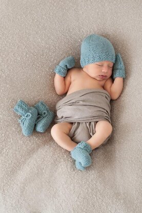 Pattern is for sizes Newborn-3mths, 3-6mths and 6-12mths. Instructions are for knitting on two needles. It uses 4ply (fine fingering yarn). Pattern includes the beanie, mitten and both pairs of booties instructions.