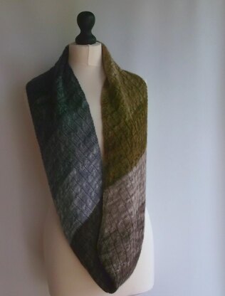 | One size only: | This long cowl uses twelve mini skeins working a cable pattern on the bias. Wear long for cover up or wrapped around the neck to keep warm and snuggly. |