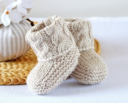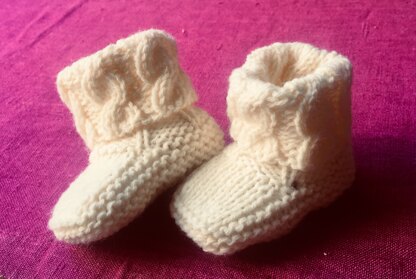 The pattern is a fully illustrated tutorial with colour photos to show you each stage from start to finish. As such it is suitable for improving beginners keen to try out their basic cabling. The booties are knitted flat on regular, straight needles. They are made in one piece so there is minimal sewing - just a back seam and a short seam at the back of the heel.