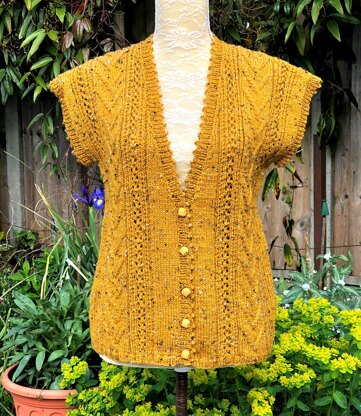 A really beautiful, useful gilet. This design has great stitch detail comprising easy "v" shaped cables, bordered by neat eyelet patterns. The back is worked in stocking stitch with the front and armhole borders edged with a pretty picot edging.