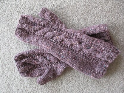 This is a pattern for cable fingerless gloves, originally designed for knitting magazine. They are 30 cm long, in a tweedy aran yarn with a cable running along the back. There are no fingers to shape just the thumb.