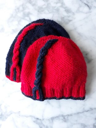 Instructions are given on how to create a longer hat, by working more repeats of the cable pattern. Instructions are also included on how to create a variation of the hat without the contrast brim (as seen in the black and neon green hat pictured after the navy blue and red hats above).