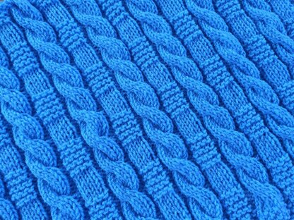 An interesting combination of soft cables and garter stitch blocks give this blanket a lovely soft and squishy texture.