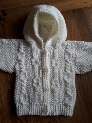 Baby hoodie, age 0-6 months, chest 20", suitable for boy or girl. Knitted in one piece to armholes in a cable and moss stitch design
