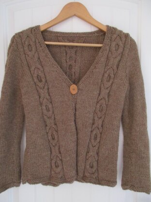 This is a pattern for a cable panel cardigan, originally published in Knitting magazine. It is in stocking stitch with a noughts and crosses cable panel, garter stitch edges and a one button fastening. The yarn has now been discontinued, any yarn knitting to the same tension can be used.