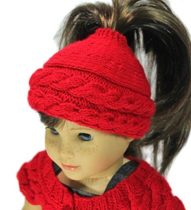 A trendy hat for your 18 inch doll with a fun and active look. This hat has a hole in the top for her ponytail to go through. Love knitted cables? This hat is the perfect accessory to match any cable sweater. It has two rows of cables around the edge and was originally designed to match the Cable Shrug pattern.