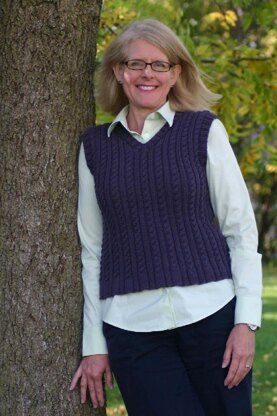 This vest is made entirely of cables and ribs so there is a lot of give to the fabric, horizontally. Each size will stretch to fit many sizes.